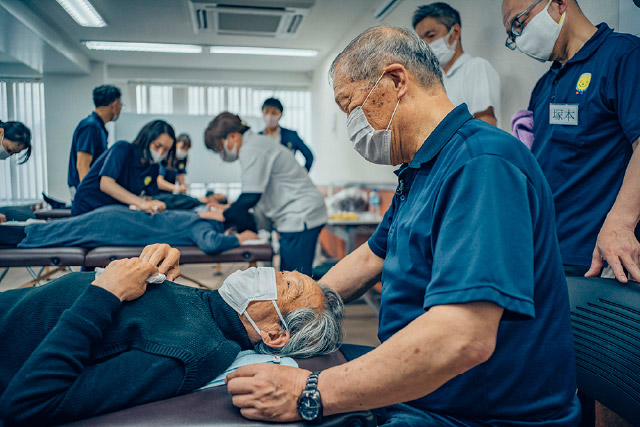 施術会が始まると、1つのベッドに3~4人ついて施術を行います。西村先生がお腹を施術すると、「息ができないほど痛い!」と叫ぶ方もいらっしゃいました。西村先生が「息してるじゃない!」と言って笑わせながら施術すると、ある瞬間フッと抜けて軽くなったように見られました。
